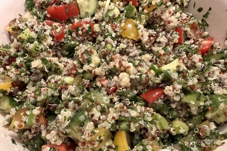 - Combine Tabbouleh: To a large bowl, add cooled quinoa, chopped parsley and mint, green onions, drained cucumbers and tomatoes, and dressing, and toss to combine. Taste and adjust seasoning.
