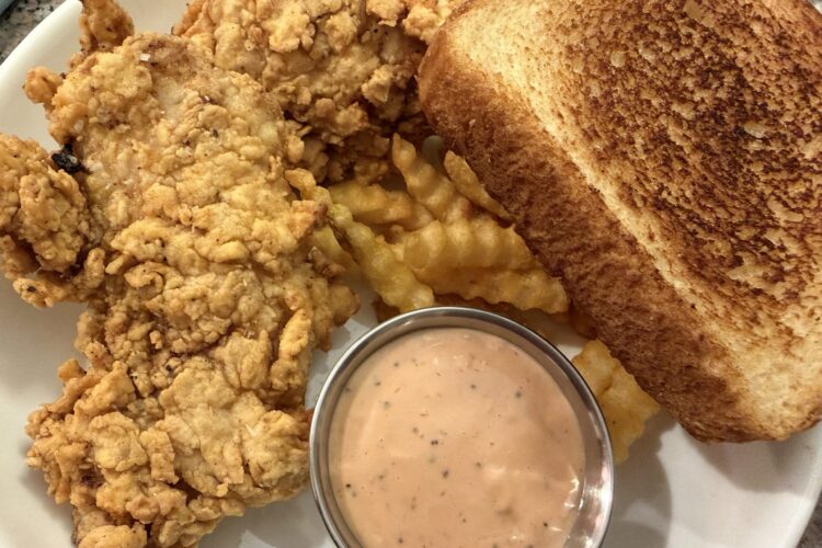 - Serve chicken with fries, sauce, and Texas toast.