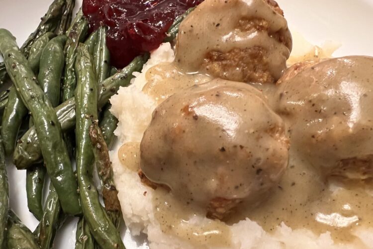 Turkey meatballs adapted from Caroline Chambers, and gravy adapted from Averie Cooks.