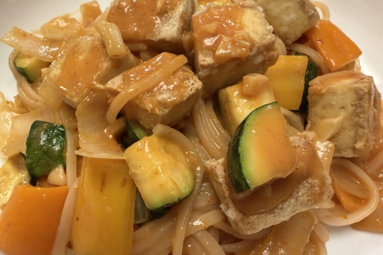 • Combine: Once the sauce is smooth add cooked noodles and toss to combine. Then add the cooked veggies and toss to combine. Top with the crispy tofu.